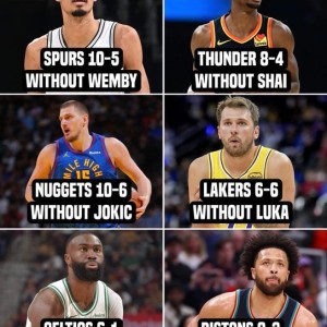 马刺无文班 10胜5负雷霆无亚历山大 8胜4负掘金无约基奇 10胜6负湖人无东契奇 6胜6负凯尔特人无杰伦·布朗 6胜1...