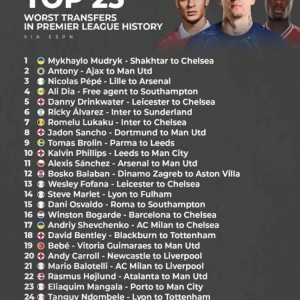 4月7日讯 ESPN评选出了英超历史最糟糕的25笔转会,穆德里克加盟切尔西居首,安东尼加盟曼联次之。...